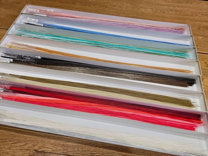 水引は長野や愛媛など水がきれいなところに産地があるそうで、和紙を細く裂いて水を含ませながら縒っていきこよりを作り、糊などで固めたところに、色のついた色やフィルムを巻き付けて作られています。何十色も用意された中から、まずは使いたい3本をチョイス。