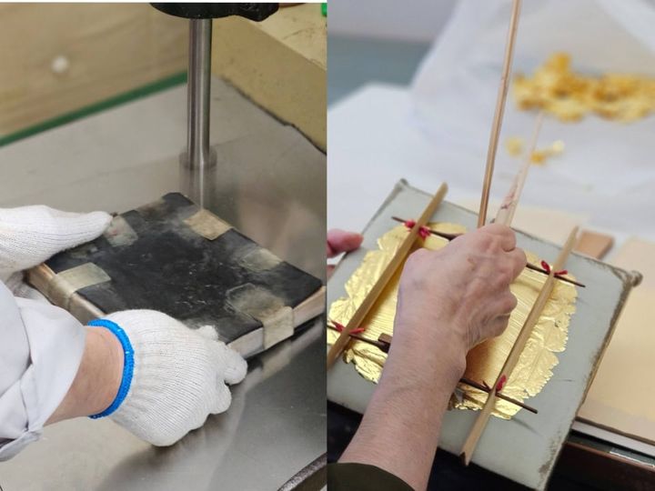 「縁付金箔」とは400年以上の歴史がある伝統的な金箔で、手漉きの雁皮紙(がんぴし)で作られるため、金箔に和紙の格子目があるのが特徴です。金箔を作るのには金合金を作り、機械で打っていくのですが、その際に使う箔打ち紙の仕込みが最重要。手漉きの雁皮紙(がんぴし)を水や藁の灰汁・柿渋・卵白(注1)などに浸した後に絞りこみ、機械打ちしていきます。これを繰り返し、約半年間をかけて紙を仕込むのだそう。その紙を使って金合金を千分の1ミリから1万分の1ミリにまで伸ばして「箔」にし、また別の職人さんが竹枠で手早く裁断する「移し仕事」を……。この移し仕事(写真右)を実際に体験させてもらいましたが、簡単なように見えてかなり難しく、長年経験を積んだ熟練の技でしか美しい金箔は仕上げることができないことを再認識。