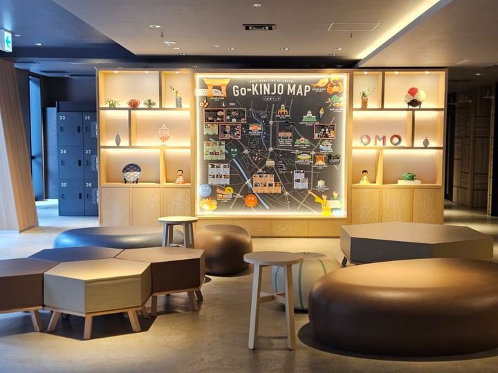 エントランスを入り1Fのパブリックスペース「OMOベース」には。ホテルのご近所の魅力的なスポットが紹介された「ご近所マップ」が。街をこよなく愛するスタッフの方々が実際に足を運び、おすすめしたいスポットをまとめたもの。食通や業界人が足を運ぶ知る人ぞ知るお店や、ツウな飲食店、伝統工芸品を扱うお店など、すべて徒歩圏内で行けるスポットなので、滞在中のさらなる充実度アップにひと役買ってくれそう!