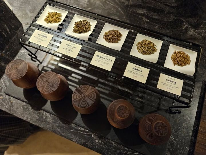 ホテルの近所にある老舗茶店で指南を受けたホテルスタッフさんが、加賀棒茶の歴史や茶店ごとのこだわりなどについて説明してくれたあと、5種のお茶の香りをかぎながら好みのお茶を選びます。加賀棒茶とは石川県特産のお茶で、お茶の「茎」を焙煎して作られますもの。自然な甘みと香ばしい香りが広がるのが特徴で、焙煎の仕方や茎の部位により、香りも味わいも違ってくるのだとか。5種それぞれ全然違う! 私はキャラメルのような濃厚な甘みが魅惑的な、丸八製茶所の「加賀棒茶 ほうじたて」をチョイス。