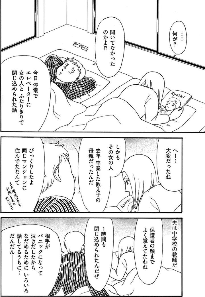 「エレベーターで抱きつかれちゃった」自慢げに語る夫に呆れる妻