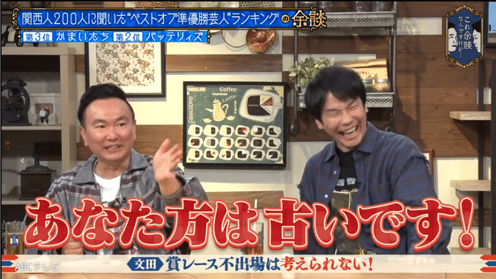 そんな文田に山内が「あなた方は古いです!昔の芸人さんです」と言い切ると、文田は「だって(賞レースは)勝手にマネージャーがエントリーしてるもんだから」と吐露。濱家が「『7回あるんやったら7回出ないと』というのが文田」とフォローすると、文田は「3回戦ぐらいで落ちればいいだけじゃん。落ちて箔つけてあげればいいじゃん。今年バッテリィズ3回戦で落ちたらしいぞって。みんなに幸せ配んなよ」と提案。