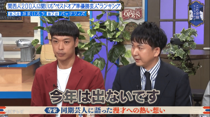 「関西人200人に聞いた惜しかった賞レース準優勝芸人ランキング」が発表される中、濱家からM-1グランプリのことを訊かれ、「今年は出ないです」と言い切ったのはM-1グランプリ2024で準優勝したバッテリィズ。寺家は「僕らあと7回出られるんで今年無理して出なくても。優勝したい気持ちはあるんで、どこかで仕上げて挑みたい気持ちはありつつ、今年は一旦集中しようという感じ」と心境を吐露した。