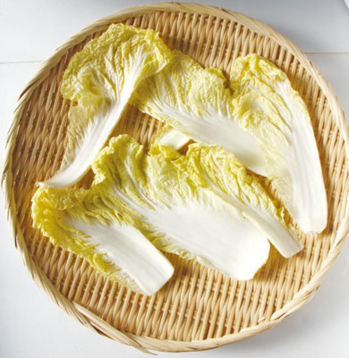 ①白菜1/4個は縦半分に切る(4〜5時間天日干しをすると甘みが増す)。