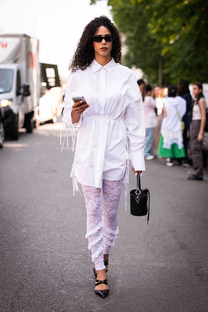 柄物よりさらにもう一歩攻めるならば、レース素材のレギンスも◎。上のストリートスナップのようなホワイトのレースレギンスと、ブラックのキトゥンヒールで、ロマンティックかつセンシュアルに。リボンとドローコードが印象的なオーバーサイズの白シャツを羽織れば、甘さとモードが共存し魅力たっぷりに仕上がる。