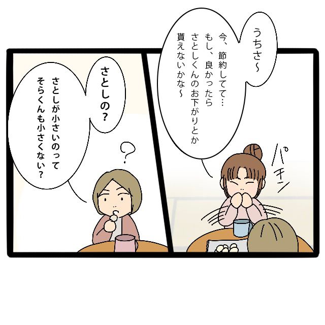 私は両手をパチンと合わせて「うち今節約してて・・・もし良かったらさとしくんのおさがりとかもらえないかな~」とお願いします。するとさとしくんママは「さとしの?さとしが小さいのってそらくんも小さくない?」と不思議そうに言いました。