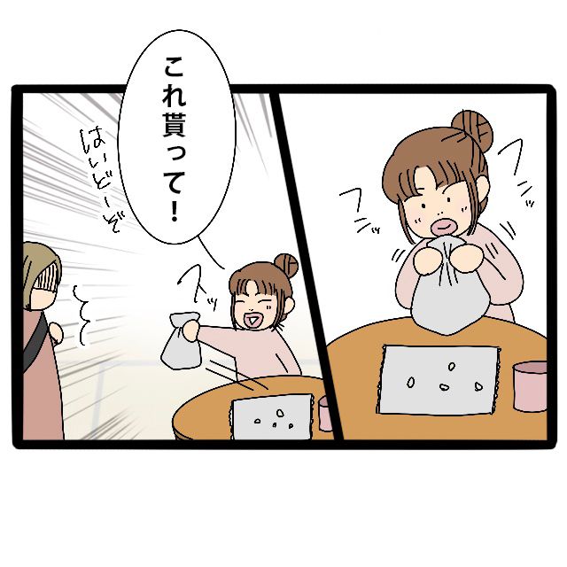 「えっいや・・・大丈夫だよ?」もらえないよーと勢い良く手を振って遠慮するさとしくんママ。私は「ううん、おさがりとかもらう約束もしたし、そのお礼!」と言い、さとしくんママにお菓子の袋を渡しました。