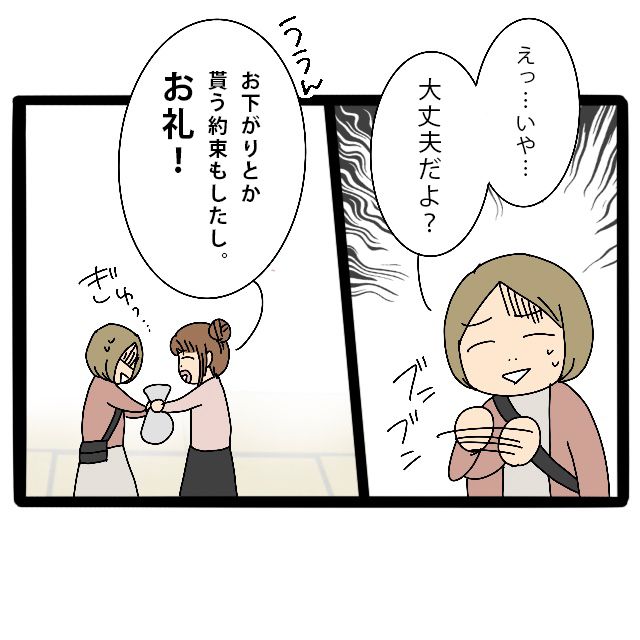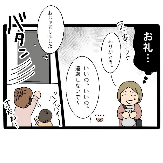 さとしくんママは戸惑ったような表情を浮かべながら、「あっうん・・・ありがとう」とお菓子を受け取りました。私はそんな様子にも気づかず、にこにこと笑いながら「いいのいいの、遠慮しないで~」と声をかけ、そのまま玄関まで見送りました。