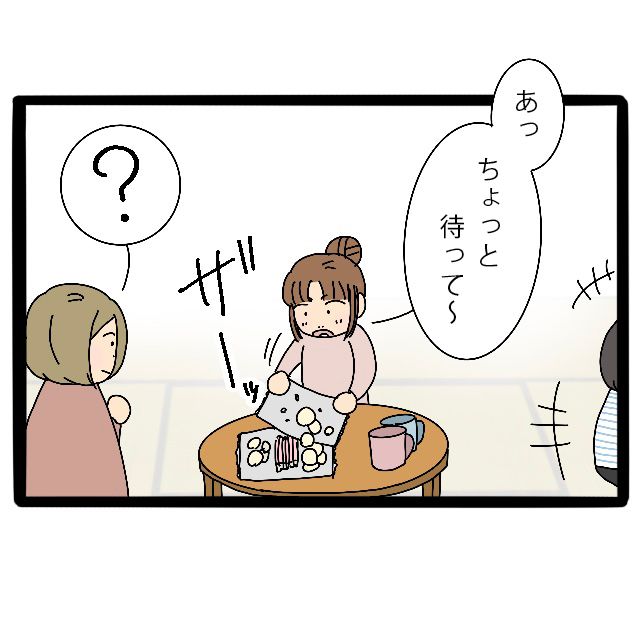 しばらく世間話を楽しみ、時刻はすっかり夕方。「もうこんな時間か・・・そろそろ帰ろうかな、今日はありがとね~楽しかった!」と言い、帰り支度を始めるさとしくんママ。私は「あっ、ちょっと待って~」とさっきまで食べていたお菓子をザーッとまとめます。