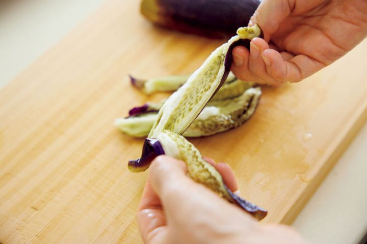 なすは手で裂くことで、断面に凹凸ができてたれがからみやすくなります。 なすは表面がさわれるくらいになっても裂くと熱いので、気をつけて作業してくださいね。