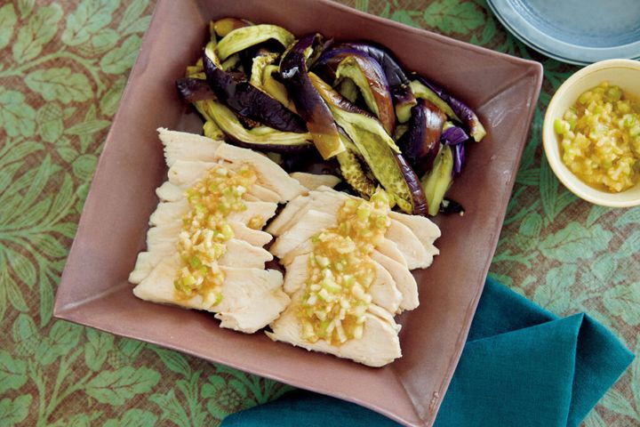 強めの中火にかけ、蒸気が上がったらふたをして弱火にし、火が通るまで10分蒸す。鶏肉を取り出し、粗熱が取れたら薄いそぎ切りにする。なすは粗熱が取れたら縦に4~6等分に裂く。ともに器に盛り、ごま油を回しかけ、ねぎみそだれをかける。