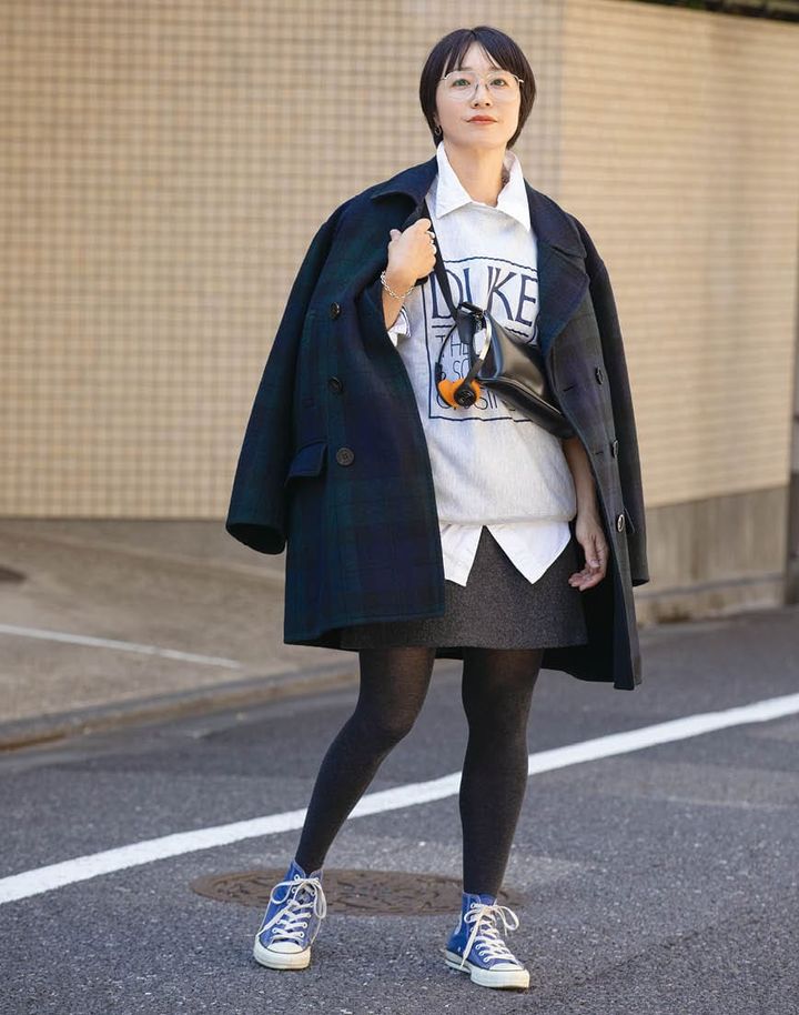 「私にとってチャンピオンのスエットがカジュアルトラッドの代表格。さらにシャツやミニスカ、ウエストポーチで休日スタイルをイメージ」