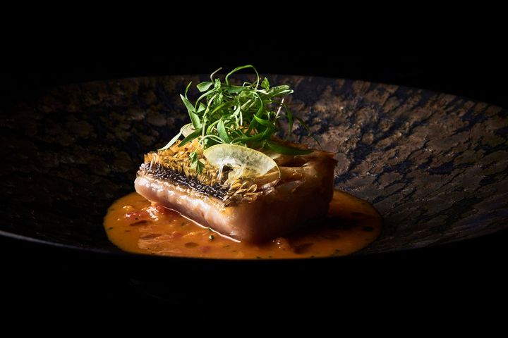 ⽢鯛を厳選し、鱗は残したまま⾼温で⽕⼊れをすることで鱗のクリスピーな⾷感とふっくらとした⾝の⾷感のコントラストを楽しめる⼩林圭シェフを代表するお料理の鱗焼きを、魚介の旨みを存分に感じられる一品に。