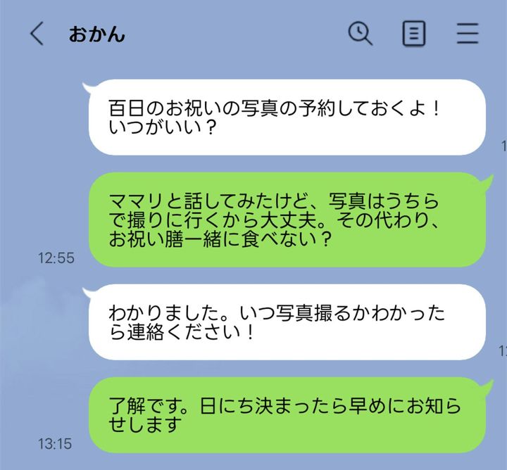 なので写真は自分達でするのでお祝膳なら一緒にどうですかと言ったところ。「分かりました写真はいつ撮るのか撮る日が決まったら教えて」ときました。