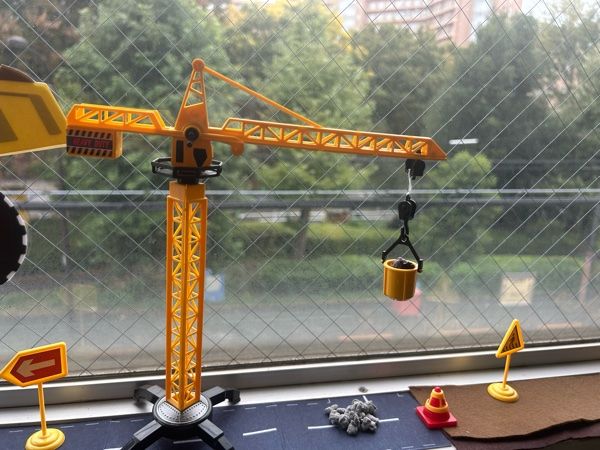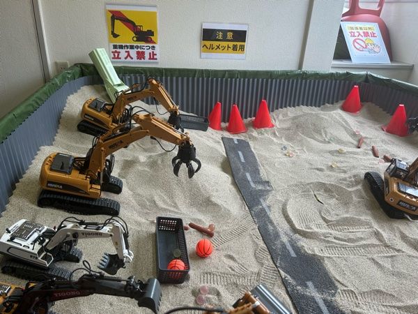 1階がカフェのビルの内階段を3階まで上がったところにある工事現場を模した砂場で”砂を掘るショベルカー”や”ボールなどをつかむ形のショベルカー”のラジコンなどで遊ぶことができるんです。