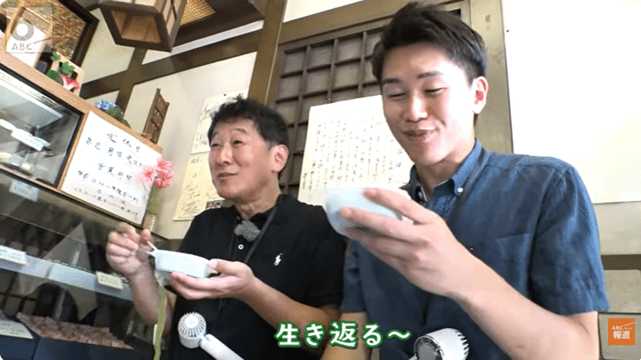 しばし古墳を見て気が済んだのか、再び竹内街道へ。そろそろお腹が空いてきた2人が見つけたのは、昔ながらの和菓子屋さん。笑顔で迎えてくれたやさしいご主人から、名物の「くるみ餅」や「生キャラメルプリン」をいただき、柴田アナと中村アナは「生き返る〜!」「染みわたる〜!」と感激しきりです。