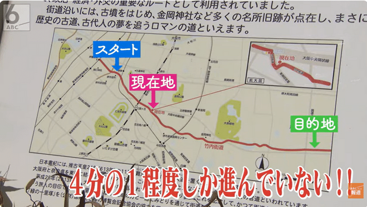 ここでしっかりとパワーをチャージし、ようやくしゃべ歩きを再開させた2人。10分ほど歩いたところに竹内街道の石碑と案内板を見つけます。ここに記されていた街道の地図を見ていた中村アナ。「ちょっと恐ろしいことを見つけちゃったんですけど…」と衝撃の事実に気づきます。