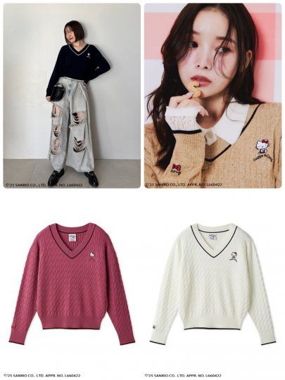 ケーブル編みとVネックでカレッジライクなプルオーバー。胸元のワンポイント刺繍だけでなく、袖口にもSNIDELロゴとキティのリボン刺繍をあしらい、手元を動かした時にチラッと見えるのもポイント♡