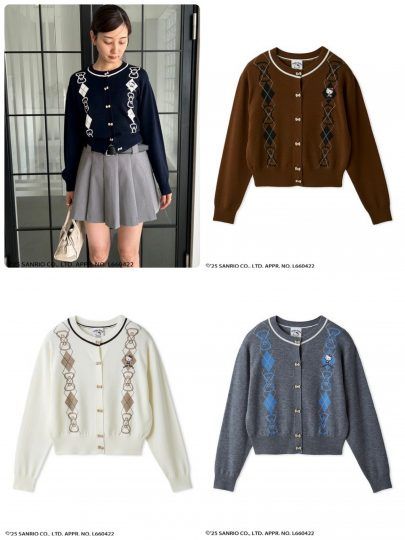 ハローキティとアーガイル柄を組み合わせたカーディガン。胸元にHello Kittyロゴとキティのワンポイント刺繍を施し高級感のある印象に。今季トレンドのトラッドスタイルや、シンプルコーデのアクセントにピッタリです。