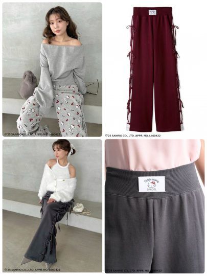 ゆったりはけるスウェットパンツ。カジュアルでありながら、サイドのベロアリボンのレースアップで華やぎをプラス。ウエストのセンター部分にHello Kittyのロゴが入ったネームタグを施し特別な1枚に。