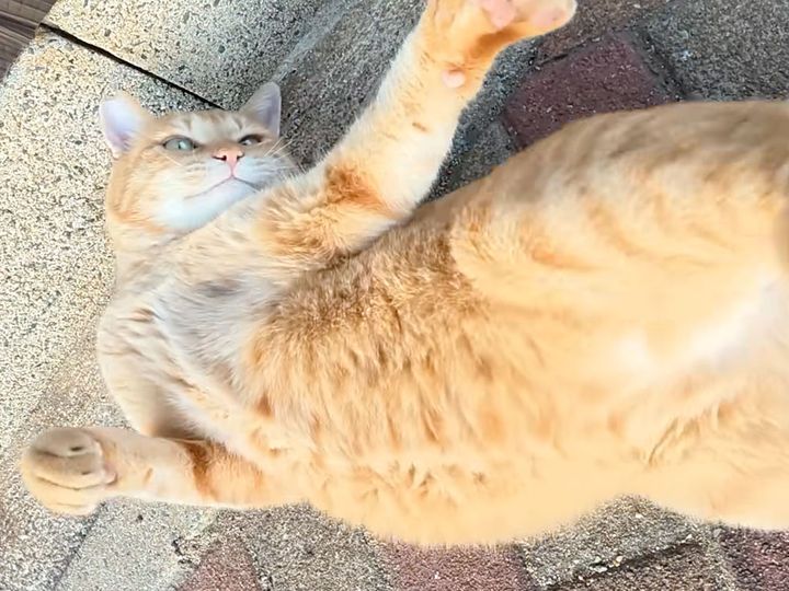 道端でのんびり寝そべるぽっちゃりな茶トラ猫さん。