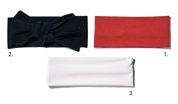 1.レッドターバン/SEA(エスストア) 朱色に近い赤。 2.リボンつきターバン/venit(ハルミ ショールーム) 立体的なリボンの見せ方で印象が変化。 3.ホワイトリブターバン/アネモネ(サンポークリエイト) 清潔感もプラスできる。