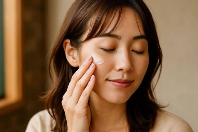 乳液・クリームは、頬→目元→口元の乾きやすい部分から。薄い膜をかけるように“押し込む保湿”をすることで、翌朝の肌がふっくらと整い、影が減り、トーンが均一に見えます。