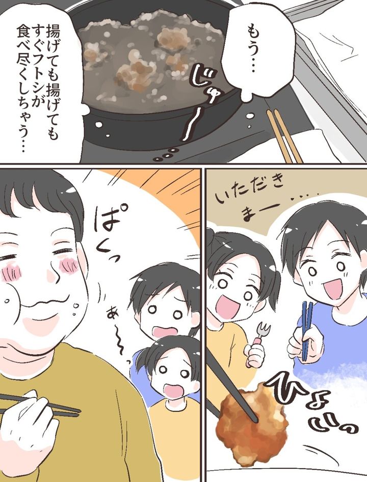 揚げても揚げてもすぐにフトシが食べ尽くしてしまいます。子どもたちが食べようとしても、フトシは全く気にすることなくお皿を空にしてしまいました。今揚げているから、その間にコールスローサラダを食べて待ってて・・・とユウヤとサラに言おうとしたとき、フトシが振り向きました。