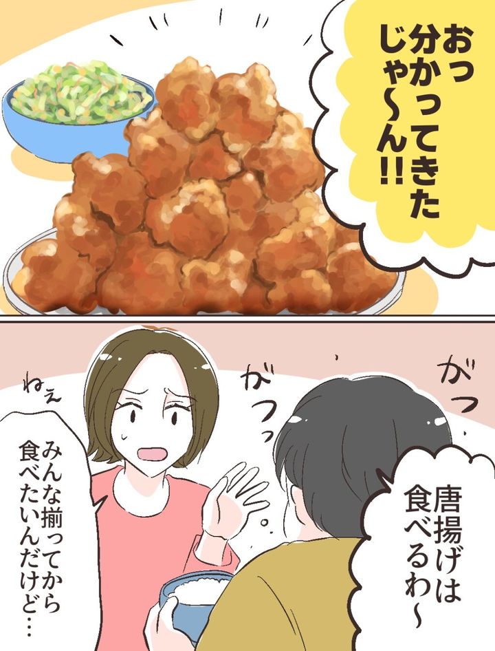 夕飯の時間になると、まだ呼んでもいないのに真っ先にテーブルにつくのはフトシ。山盛りの唐揚げを見つけて「おっ、わかってきたじゃーん!」と嬉しそうに言うが早いか自分だけさっさと食べ始めました。「唐揚げは食べるわ~」と言いながらすごい勢いで口に運んでいきます。私が慌てて「みんな揃ってから食べたいんだけど」と言ってもフトシの耳には届きませんでした。