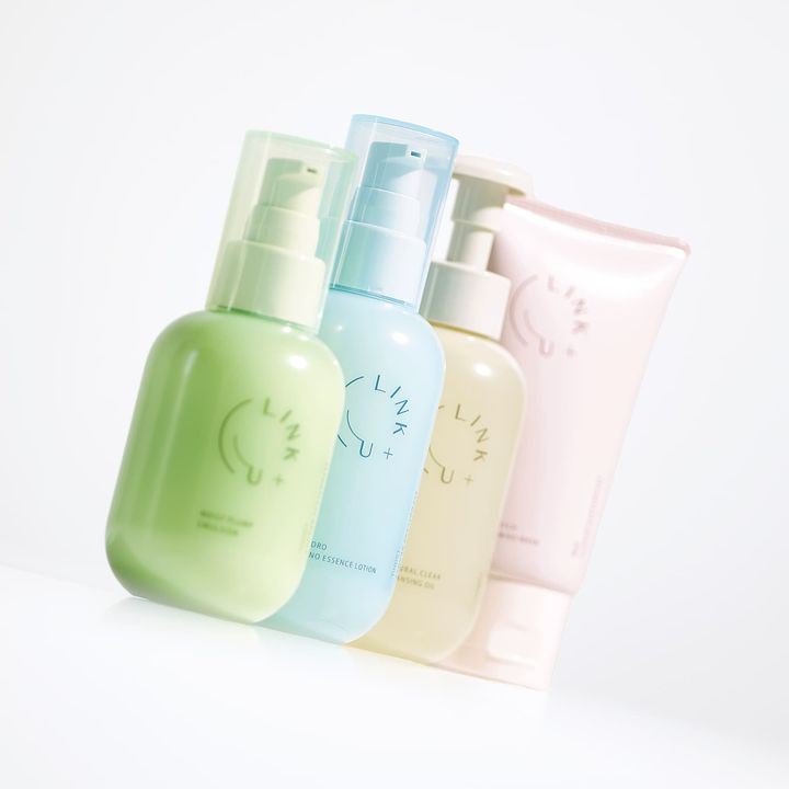 左から:リンク モイストプランプ エマルション 120ml ¥5,940、同 ハイドロ ナノエッセンスローション 150ml ¥4,950、同 ナチュラルクリア クレンジングオイル 150ml ¥4,620、同 ストレッチ フォーミングウォッシュ 90g ¥3,850(すべてLINK+U)