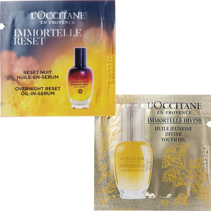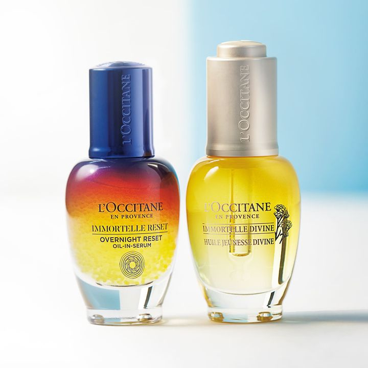 左から:イモーテル オーバーナイト リセットセラム 30ml ¥9,790、イモーテル ディヴァイン インテンシヴオイル 30ml ¥14,190(ともにロクシタンジャポン)