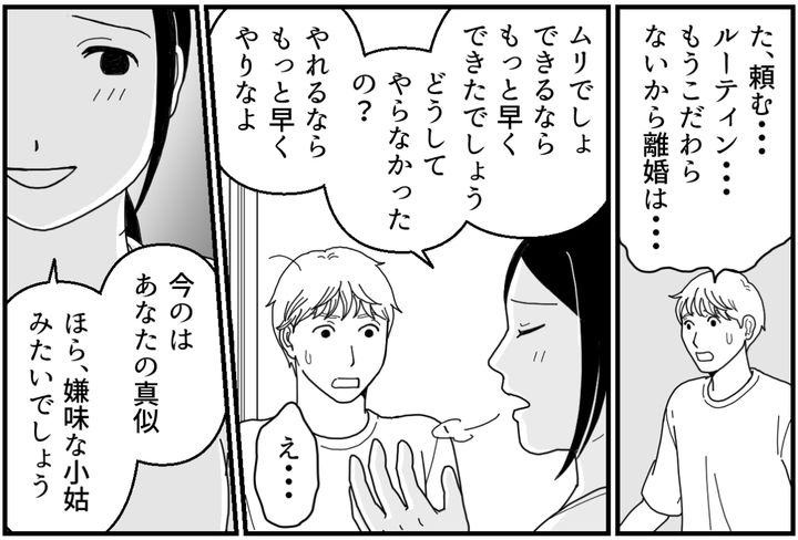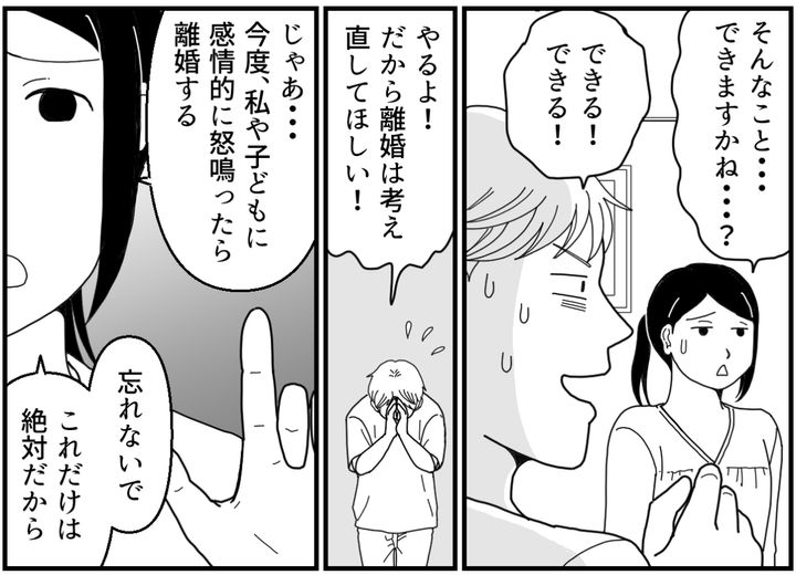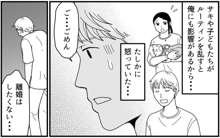 「もうあなたの機嫌を取るのは疲れました。子どもたちを思いやりのある人間に育てるためにも、あなたとは離婚したいと思います」そう言い放つサキを、俺は必死で引き止めます。「わかった、話はわかった……俺が間違っていた……」
