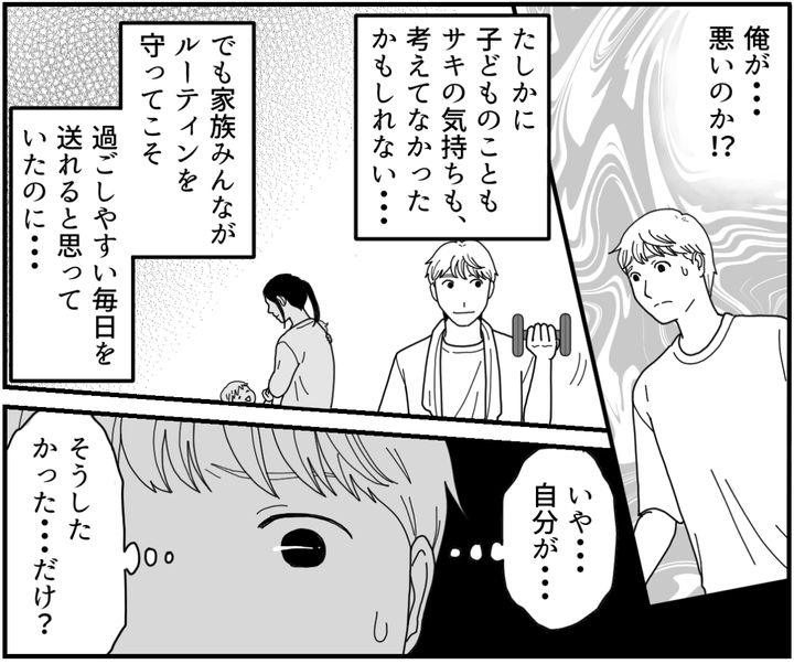 俺はタカシ。妻のサキとの間に、3才の娘ユリと、最近生まれた息子のレントがいます。今は産後の手伝いのため、実家の母が家に来てくれています。しかしなぜかこのタイミングでサキに離婚を告げられました。母もサキの味方のようで、相当怒っています。どうやらサキは俺がルーティンを優先することが耐えられないよう。俺は自分のペースを守りたくて、少しでも予定がずれるとイラついていました。母からの指摘は、俺には思い当たることが多すぎたのです。