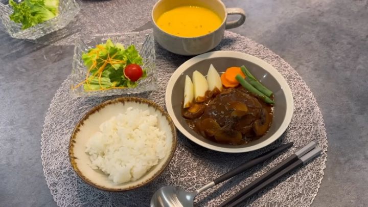 ayaさんは、牛挽肉で煮込みハンバーグを作ったそう。デミグラスソース缶と水、赤ワイン、コンソメ、ケチャップ、砂糖の入った鍋に、炒めたマッシュルームや玉ねぎといった具材、焼いたハンバーグを加えて煮込みます。ハンバーグは、一気に作って冷凍もおすすめ。焼いてから冷凍すると1カ月は保存可能で、解凍すればすぐに食べられますよ。