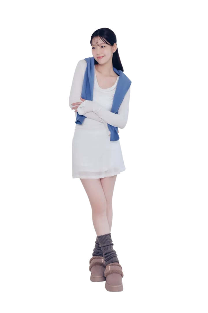 レイヤードワンピース 9,350円/ASURA(HANA KOREA)肩にかけたカーディガン 7,700円/RESEXXY レッグウォーマー 1,650円/靴下屋(Tabio)ムートンスリッポン 19,800円/ダイアナ(ダイアナ 銀座本店)