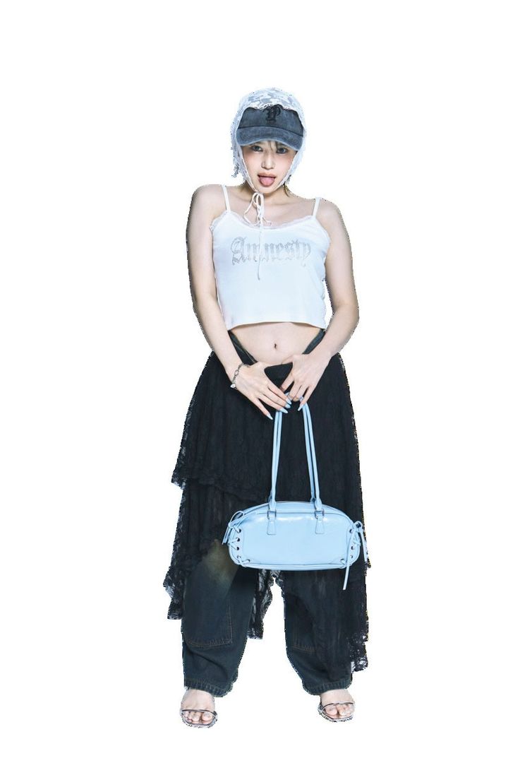 キャミソール¥2,474、レーススカート¥4,399、デニムパンツ¥4,399、キャップ¥1,649、バブーシュカ¥1,099、ブレスレット¥770、バッグ¥3,299/以上すべてウィゴー、サンダル¥11,550/ル タロン(ル タロン 有楽町マルイ店)