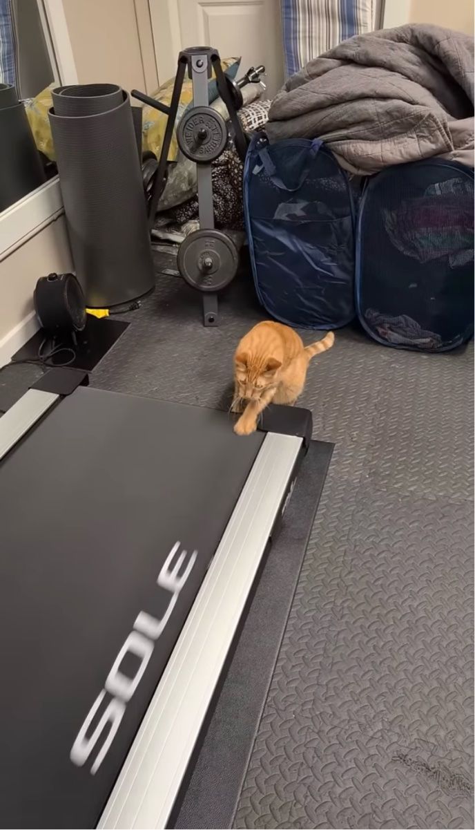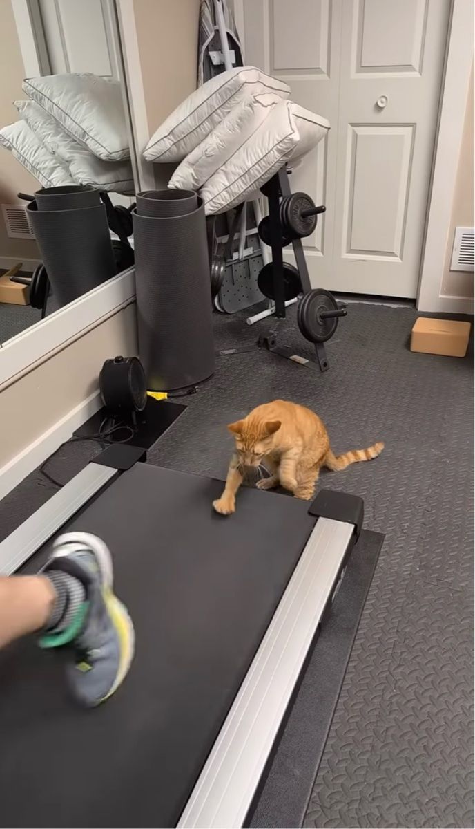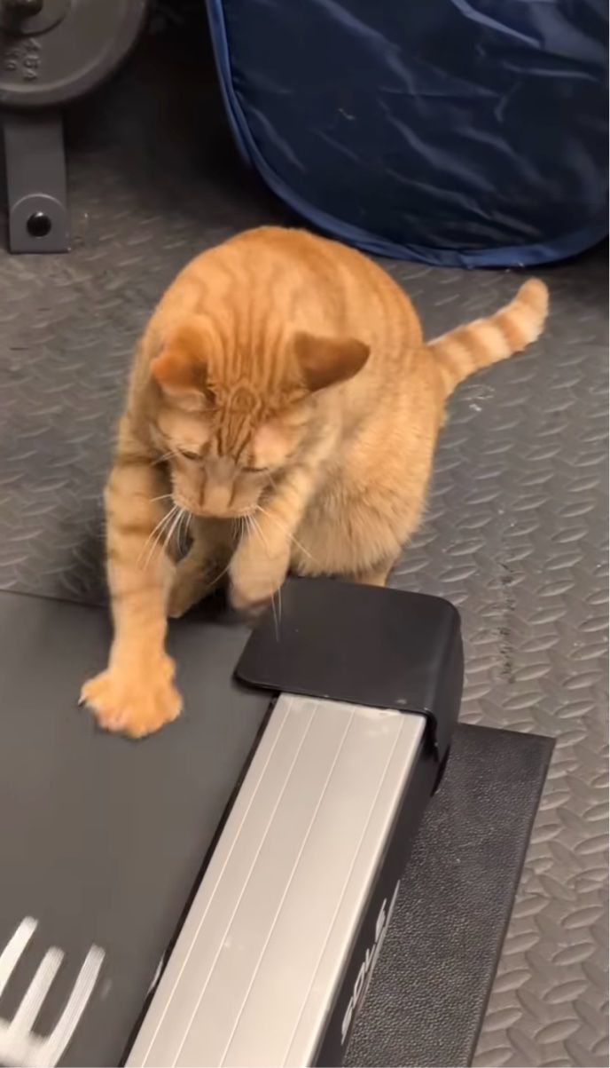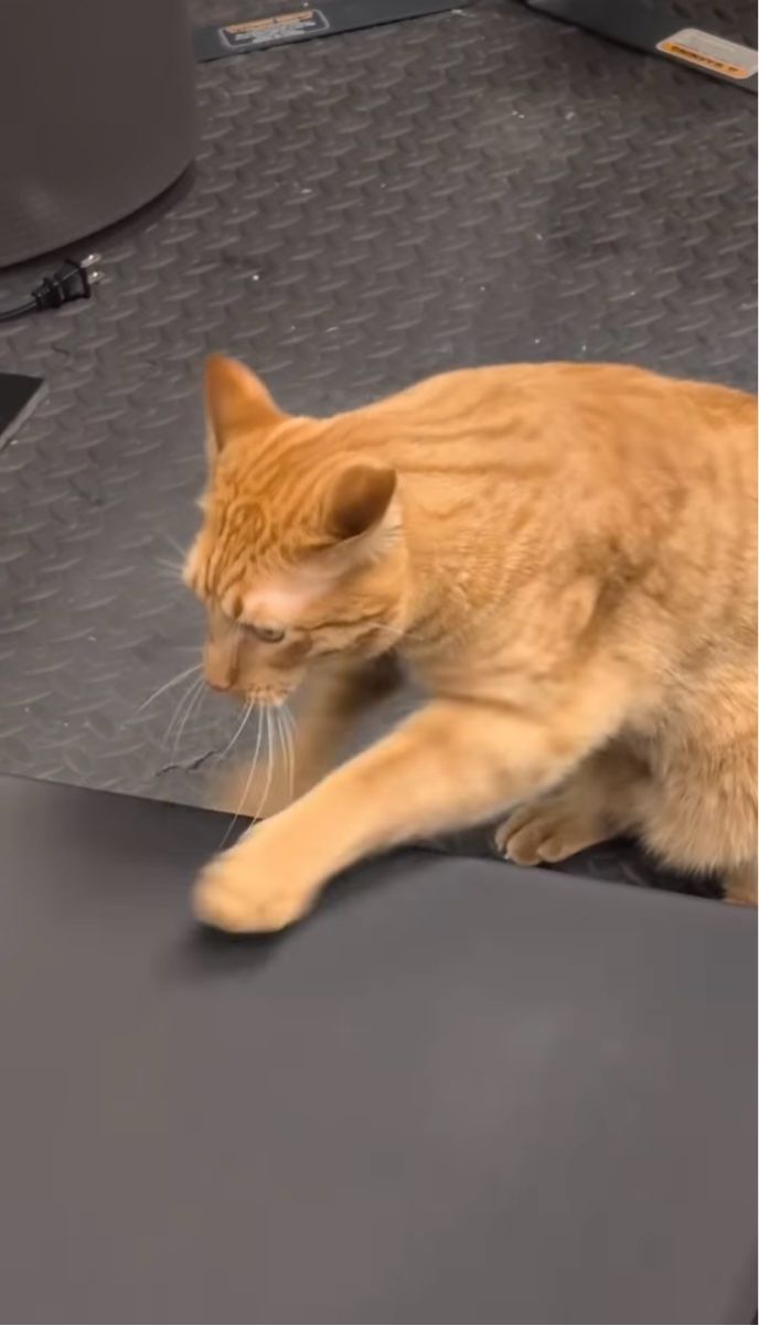 ランニングマシンで飼い主さんのマネをするようにおててを動かすネコ。 その微笑ましい姿は、こちらの動画からご覧いただけます。