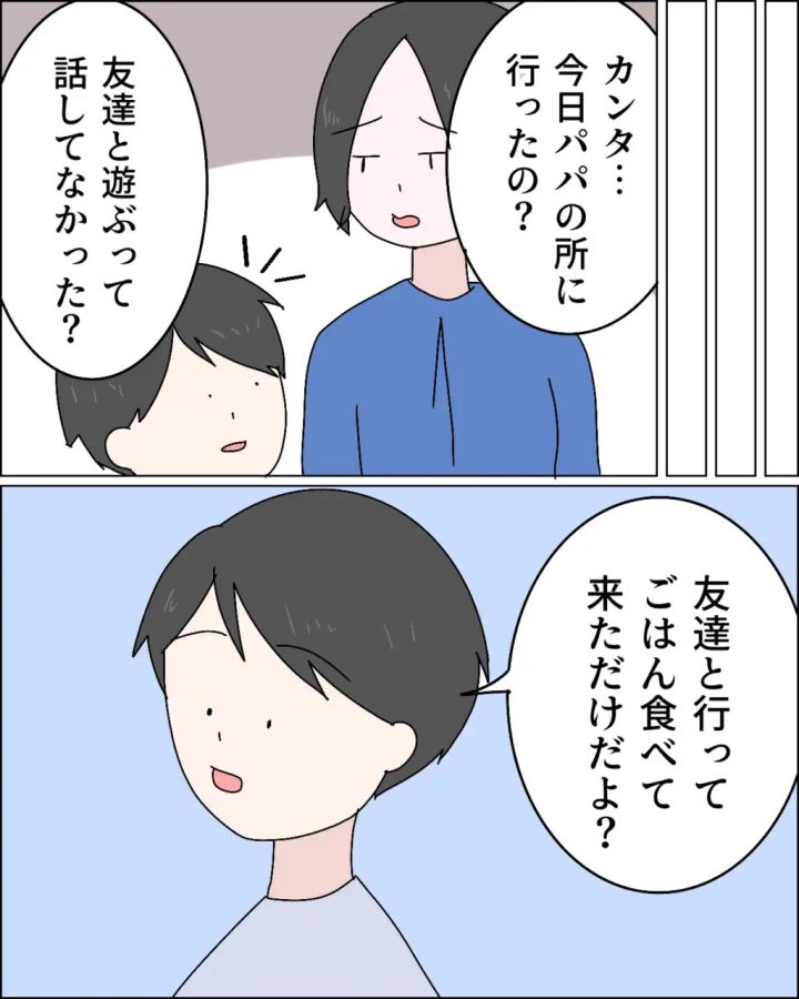その後、帰って来たカンタに、「カンタ・・今日パパの所に行ったの?友達と遊ぶって話してなかった?」と聞くと、「友達と行って、ごはん食べて来ただけだよ?」と平然と答えるカンタ。
