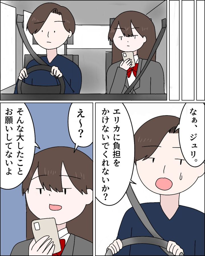 その頃、ジュリを塾に迎えに行った夫は、「なぁ、ジュリ。エリカに負担をかけないでくれないか?」と切り出しました。すると、「え~?そんな大したことお願いしてないよ」とスマホを見ながら答えるジュリ。