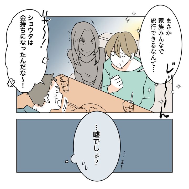 「まさか家族みんなで旅行できるなんて・・・」嬉しさを嚙みしめるように言うショウタの横で、わなわなと震える私。義父は「いや~!ショウタは金持ちになったんだな~!」と呑気に喜んでいます。難ありの義父が結婚式に出席するなんて・・・しかも費用はショウタ負担って、私たちの結婚式どうなっちゃうの!?
