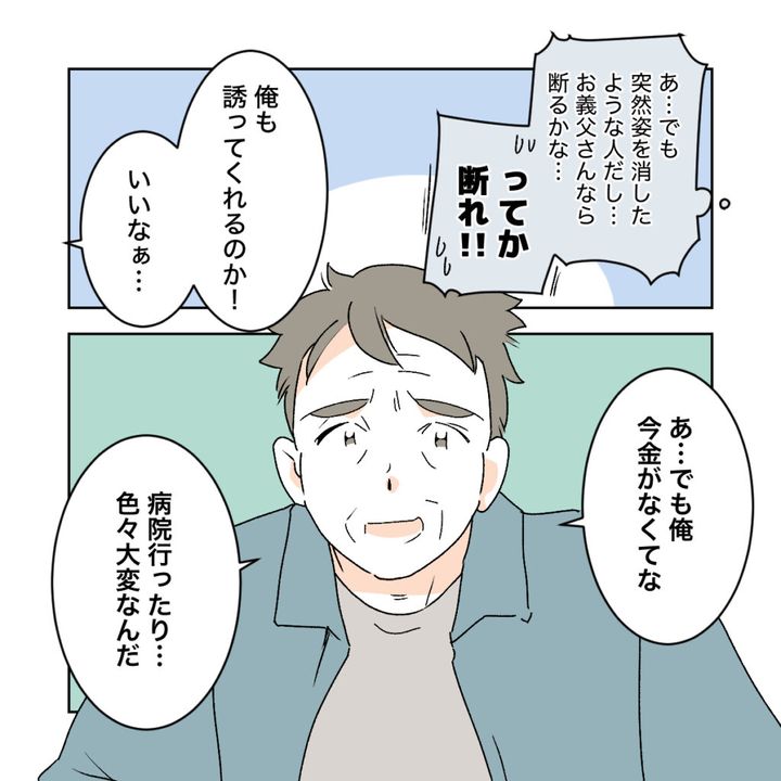 「あ、でも突然姿を消したような人だし、お義父さんなら断るかな・・・ってか断れ!」私は心の中で、義父が結婚式への出席を断るのを祈ります。しかし、義父は「俺も誘ってくれるのか・・・でも俺今金がなくてな、病院行ったり色々大変なんだ」と話し始めました。