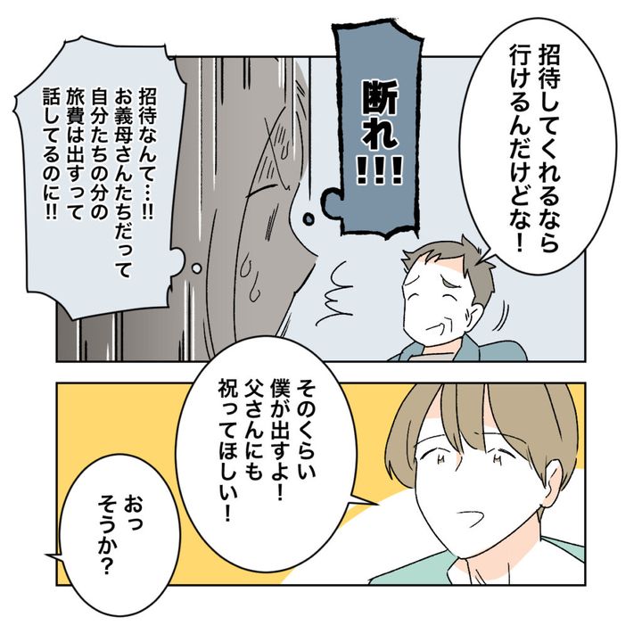 「招待してくれるなら行けるんだけどな!」遠回しに費用は出してほしいという義父に、私は心の中で「断れ!!招待なんて・・・お義母さんたちだって自分たちの分の旅費は出すって話してるのに!」と叫びました。しかしショウタは、私の心の声などつゆ知らず「そのくらい僕が出すよ!父さんにも祝ってほしい!」と言いました。