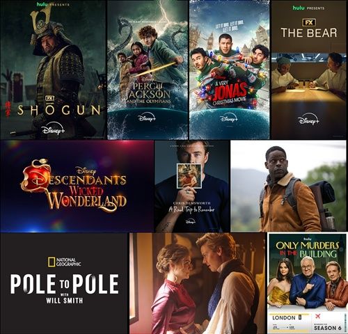 左から順に『SHOGUN 将軍』、『パーシー・ジャクソンとオリンポスの神々』 シーズン 2、『ベリー・ジョナス・クリスマス・ムービー』、『一流シ ェフのファミリーレストラン』シーズン 5、『ディセンダント:ウィキッド・ワンダーランド』、『クリス・ヘムズワース:父と絆のこころ旅』、『パラダイ ス』 シーズン 2、『ポウル・トゥ・ポウル・ウィズ・ウィル・スミス』(原題)、『アートフル・ドジャー』シーズン2、『マーダーズ・イン・ビルディング』 シーズン6