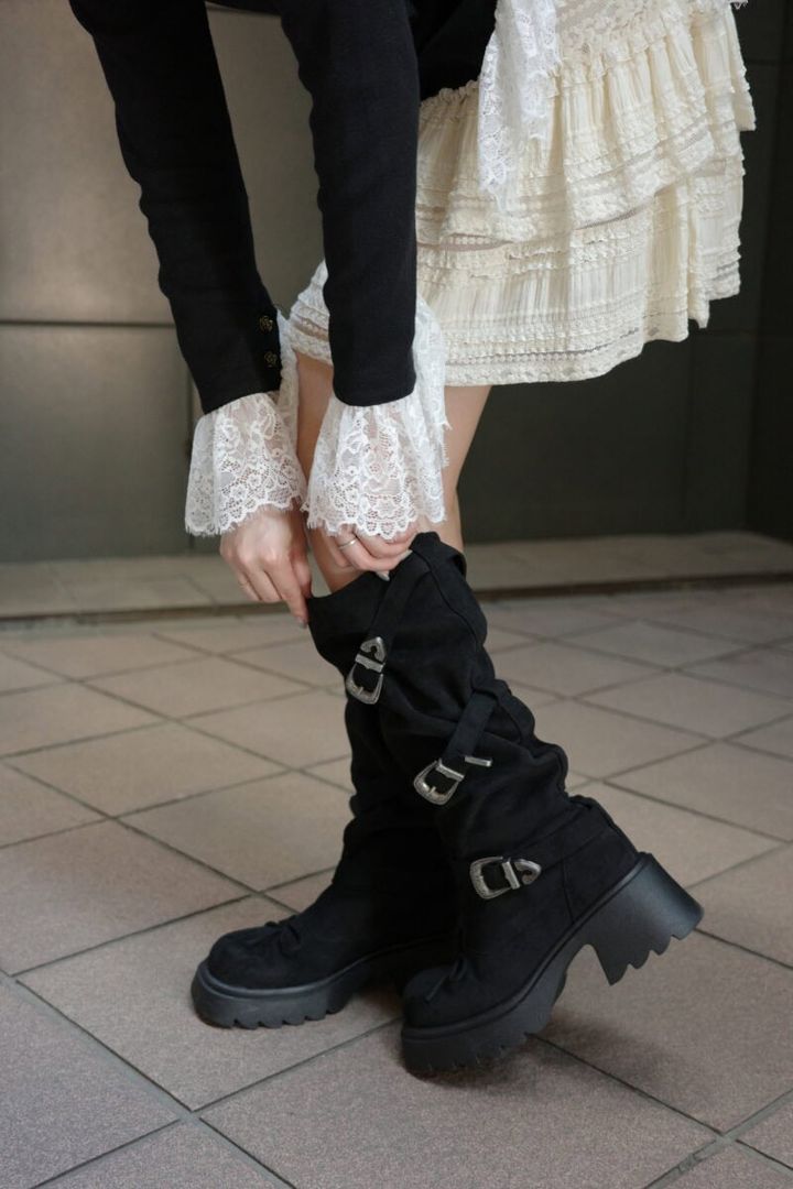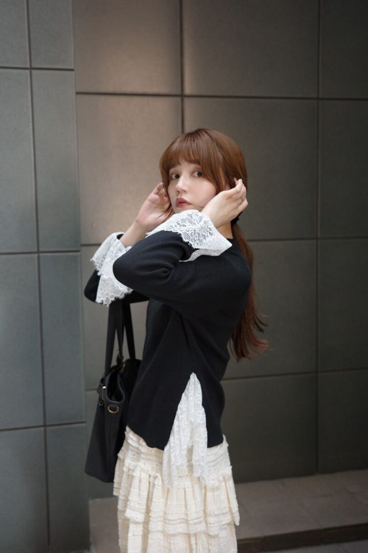 「袖のレースデザインが可愛いニットはidemのもの。ニットに合わせてフリルミニスカートを合わせました。バッグやブーツも黒でまとめて、甘さを抑えた大人ガーリーに。ボリューミーなデザインのブーツは、美脚効果も高まるのでうれしい!」(idem/ANUブランドディレクター 村田倫子さん)