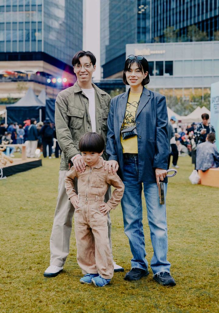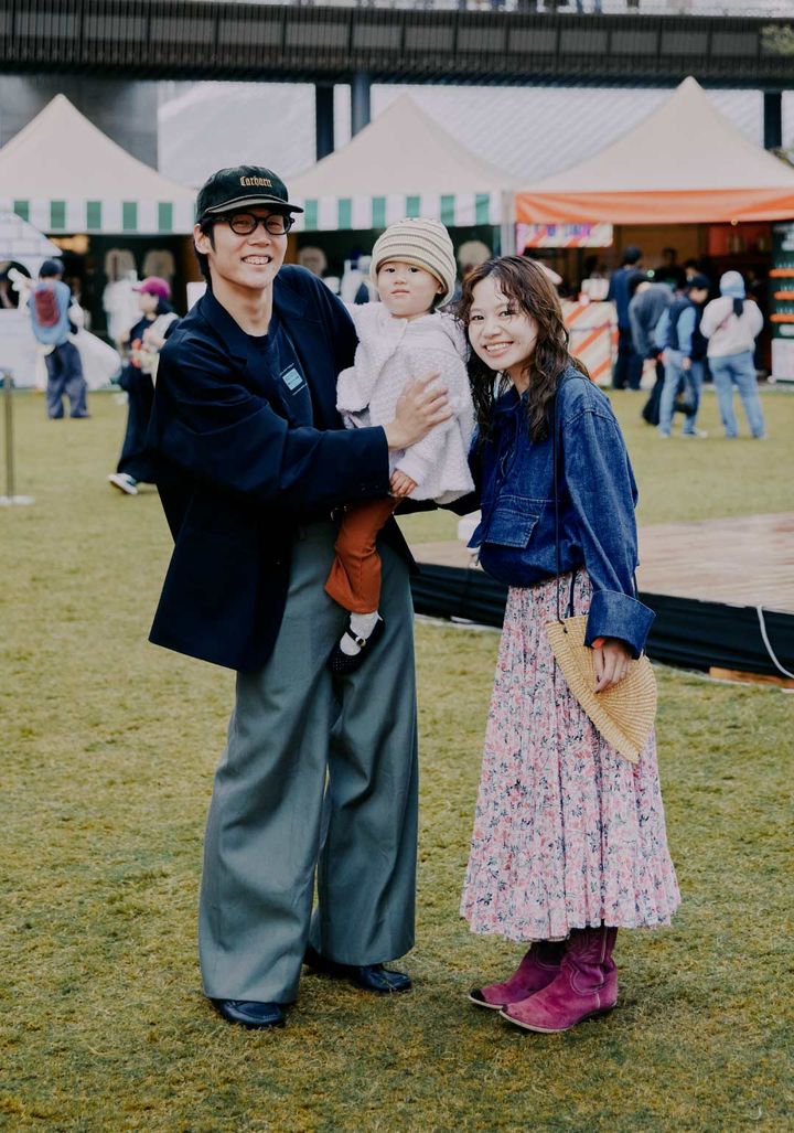 Instagram:@danchipa_「妊娠中でお腹が大きいので、夫のデニムを拝借。カジュアルになりすぎないようにジャケットを羽織りました。パパはアースカラーで秋らしく、息子はシンプルなジャンプスーツに足元で挿し色を加えています。フェスなのでスニーカーで動きやすく! バザーでキッズの『ビリー・ザ・キッド』のユーズドジャケットをゲットしたり、ミャクミャクにも会えてハッピーでした!」