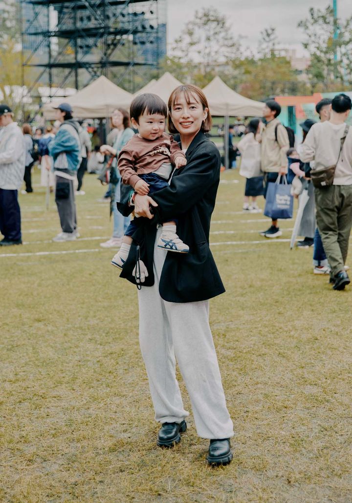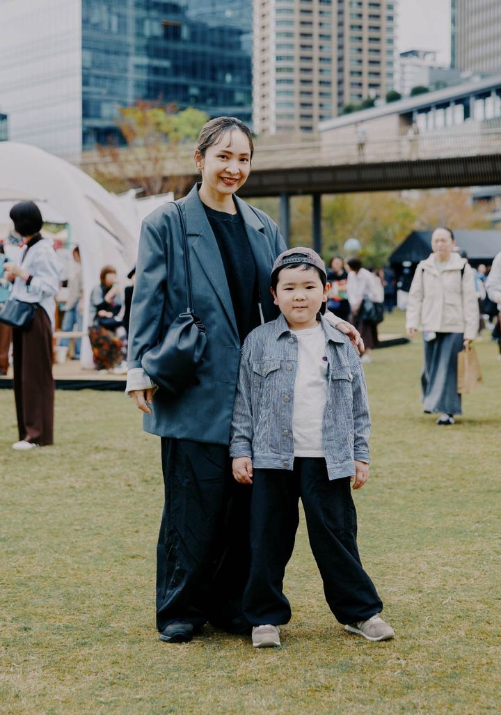 Instagram:@momoko_takamine「ママは、『BLESS』のジャケットとスカート、息子は『GAP』のトップスと『H&M』のボトムスで、ダークトーンにまとめてスタイリッシュに。うめきた公園での開催だったので、親子で気軽に参加できました。来年もぜひ行きたいです! 関西のおすすめスポットは、弁天町にある『キッズランドUS』。子どもも楽しめて親もゆっくりできるので大好きです」