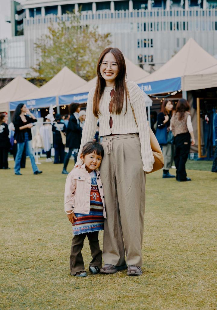 Instagram:@uu_______ii「ジャケットの中に古着のノルディック柄カーディガンをレイヤードして、息子とお揃いにしました。息子のカーディガンは『AS WE GROW』のもの。全体をブラウンでまとめて秋冬らしいスタイルにしたところもポイントです。『SLOBE IENA』のブースにあったセルフフォトが楽しかったです。おしゃれな人が多くて素敵なイベントでした!」