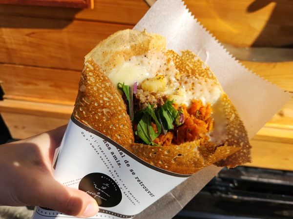 ガレットが作られ始めると、まずそば粉ガレットの生地を焼いている香りが漂って来て、その後食材が乗り、チーズやコンビーフハッシュの香りが漂ってきました。出来立てを手にできる期待感が膨らみ、より一層食べるのが楽しみになります。