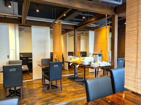 店内は、テーブル席とテーブル席の間隔が広く余裕があって落ち着きますね。13時を過ぎているのでゆったりできます。(笑)真ん中にビュッフェが設置してあります。