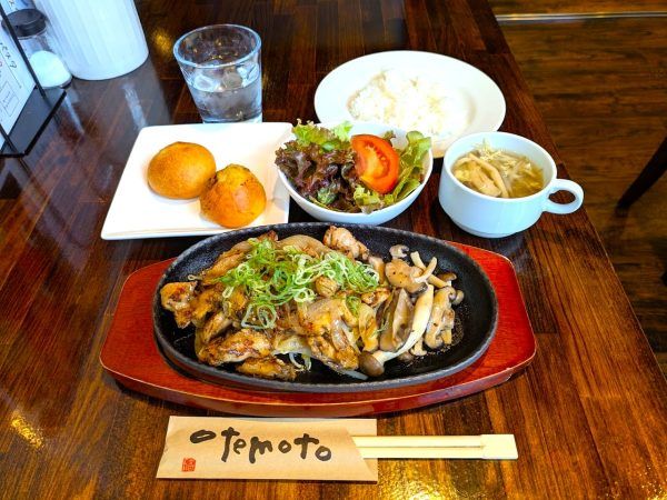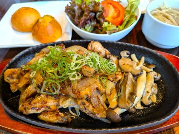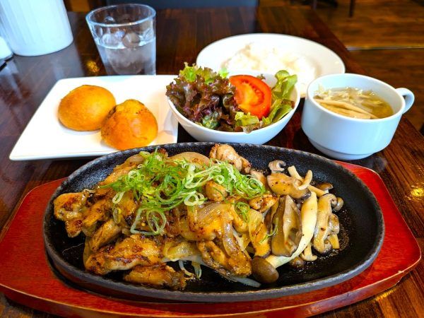 日替わりランチは、鶏ハラミの鉄板焼きとサラダに、自家製パン・ライス・スープのビュッフェが付きます。